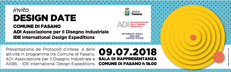 Lunedì 09 luglio 2018 abbiamo iniziato un nuovo percorso di collaborazione. Partiamo da Fasano, la mia città, che ci ha accolti con entusiasmo aprendo le porte al dialogo sui temi dello sviluppo locale ed internazionale attraverso il design.  Sono stati firmati due Protocolli d’intesa tra Comune di Fasano, ADI Associazione per il Disegno Industriale e AISBL – IDE International Design Expeditions.